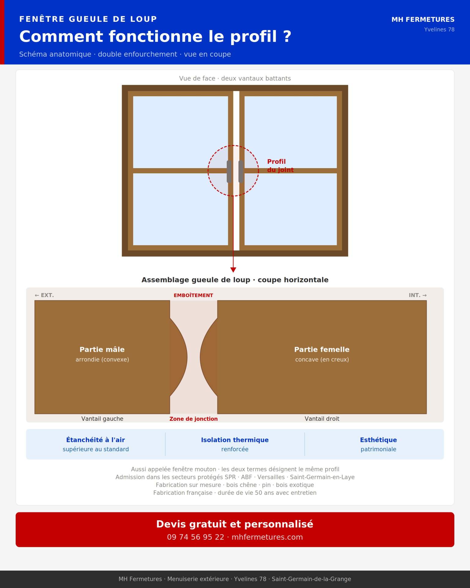 Ce système d’emboîtement, hérité des menuiseries anciennes des châteaux et des hôtels particuliers, produit une étanchéité à l’air nettement supérieure au simple recouvrement et une esthétique authentique propre à ce profil. La forme des deux vantaux encastrés l’un dans l’autre, comme une mâchoire refermée, explique le nom de gueule de loup.